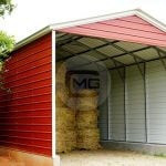 The utility carport pictured above has a width of 24’, a length of 56’, and a height of 10’. It features 14-gauge steel framing, one 9’x8’ garage door, one 36X80 walk-in door, two 30×30 windows, two additional 26’ panels, J-trim, and one gabled end. Just as this customer chose to do, you could utilize this structure to shelter your vehicle, watercraft, equipment, and use the utility section for storage.