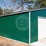 The structure displayed above is a 30’W x 20’L x 8’H steel garage with a lean-to. The main garage building is 20’W and includes horizontally-enclosed sides and ends, one 9’x8’ garage door on the front end, one 36”x80” walk-in door on the left side, and one 30”x30” window. The 10’W lean-to has a leg height of 6’ with a continuous vertical roof.