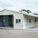 The 60’W x 60’L x 14’H unit shown above is a fully-enclosed garage with all-vertical paneling. It features four 10’x10’ garage doors and two 36×80 walk-in door frame-outs.