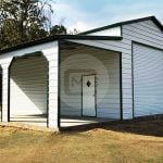 With an A-frame metal garage, also called the boxed eave style, the panels are installed horizontally, making it more affordable than the vertical style metal garages which require hat-channel pieces for installation. This type of roof can handle some heavy wind, but is not the best option for heavy rains and snowfall.